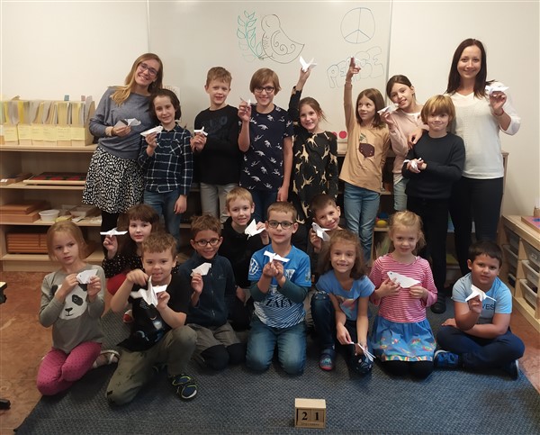 A gyerekek a beszélgetés során megismerték a béke szimbólumait, majd fehér galambot hajtogattak.