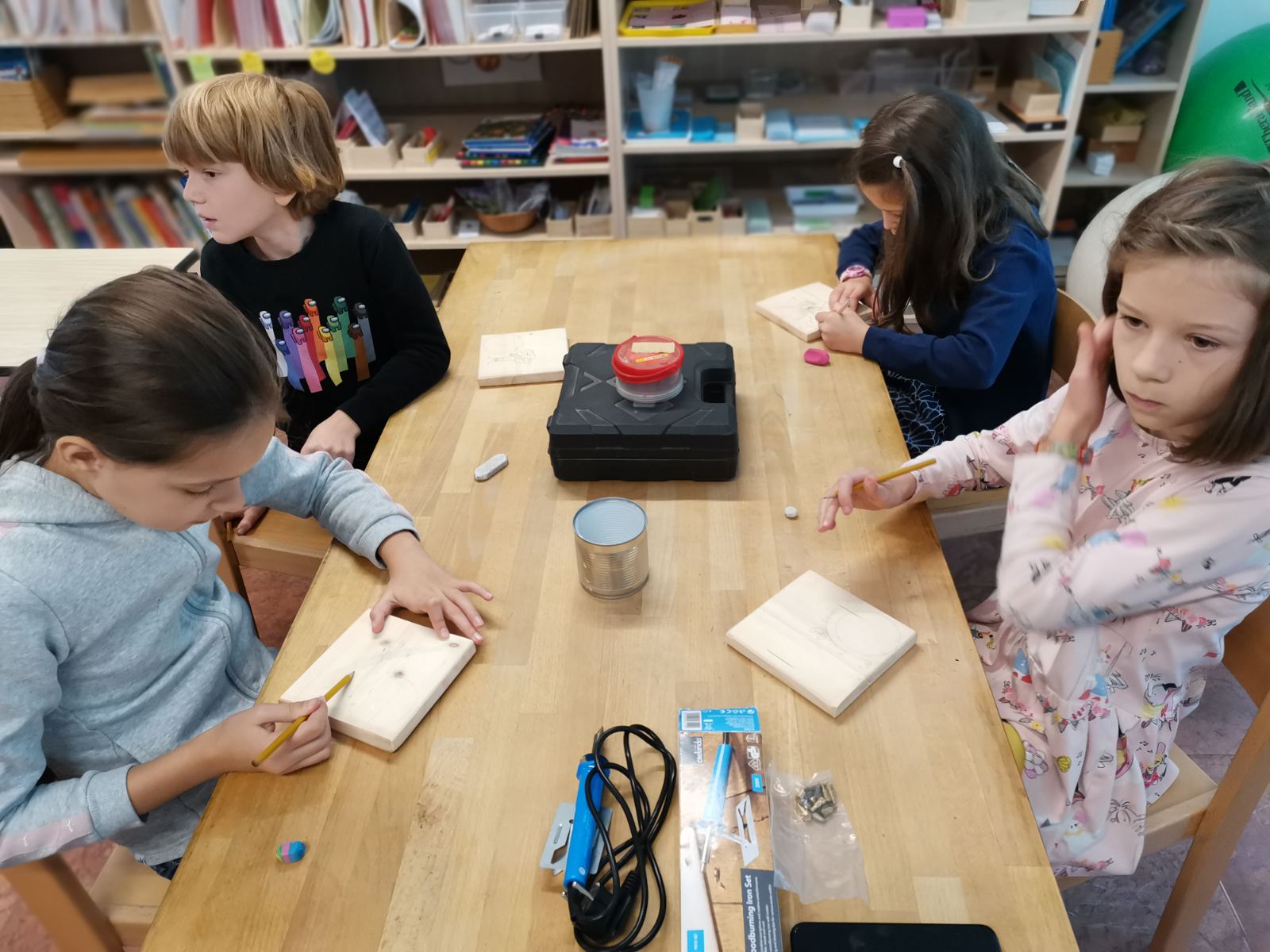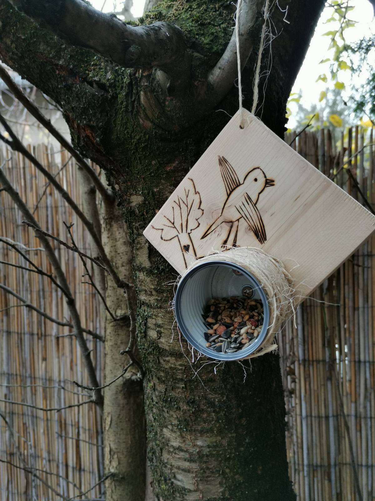Korábbi kézműves foglalkozásról megmaradt fenyőfa lapokat és konzervdobozokat használtunk fel az újrahasznosítás jegyében. A fenyőfa lapokat a gyerekek rajzai díszítik, amiket a fába égettünk, hogy tartósabbak legyenek. Festéket és egyéb kemikáliát nem használtunk a környezetünk védelme érdekében. A konzervdobozokat natúr színű madzaggal vonták be a gyerekek, majd azokat csavarral rögzítettük a falapokhoz; ide fogjuk szórni a madáreleséget.