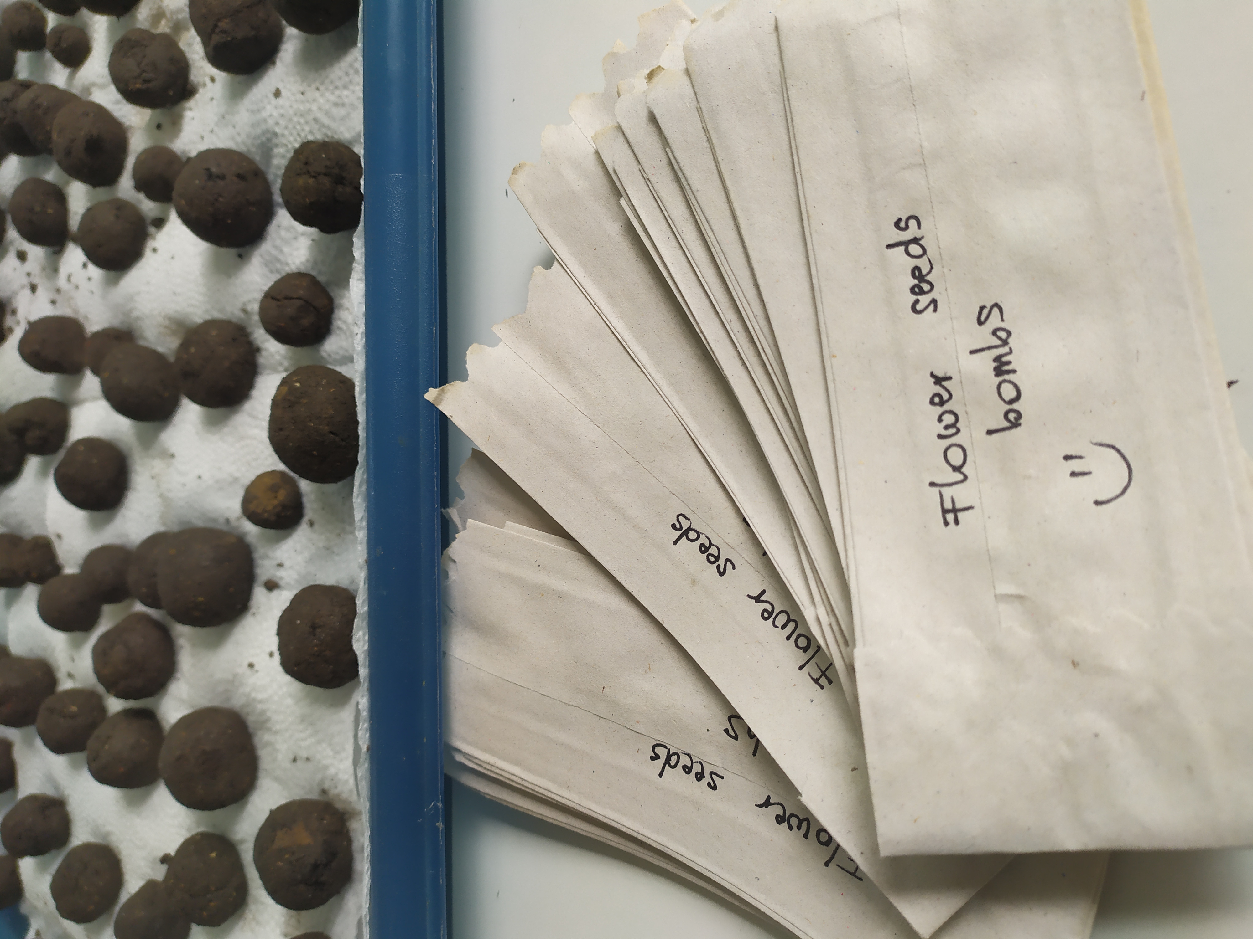 Különböző virágmagokat vásároltunk, melyeket aztán összekevertünk (kamilla, kakukkfű, búzavirág, csodatölcsér, vadvirág keverék, pillangó csalogató virág keverék). A virágmagokat virágfölddel, agyagos földdel és egy kis vízzel gyúrhatóvá kevertük, majd kisméretű gömböket formáztunk belőlük. Miután a bombák kiszáradtak, papírzacskóba szortíroztuk.