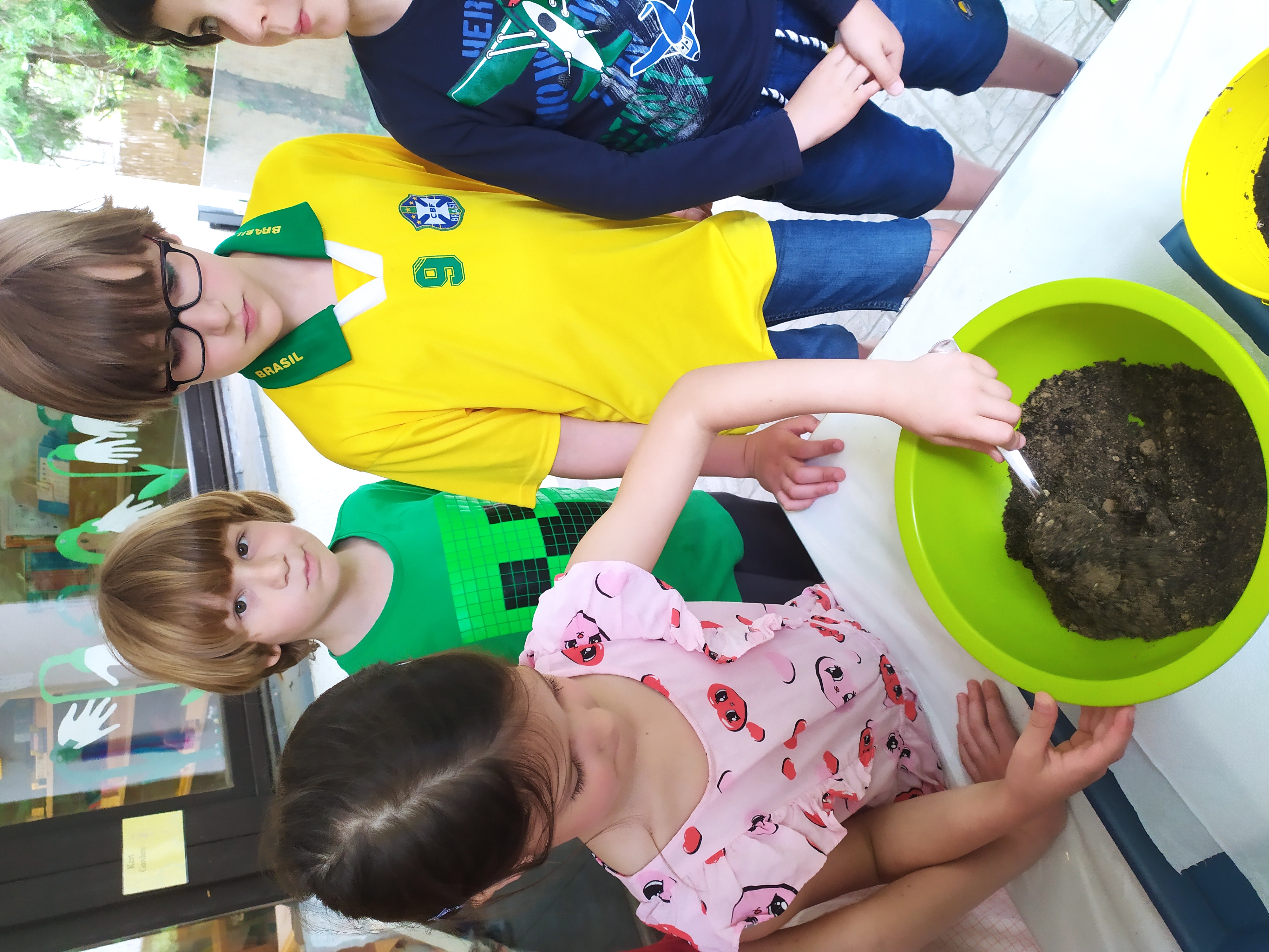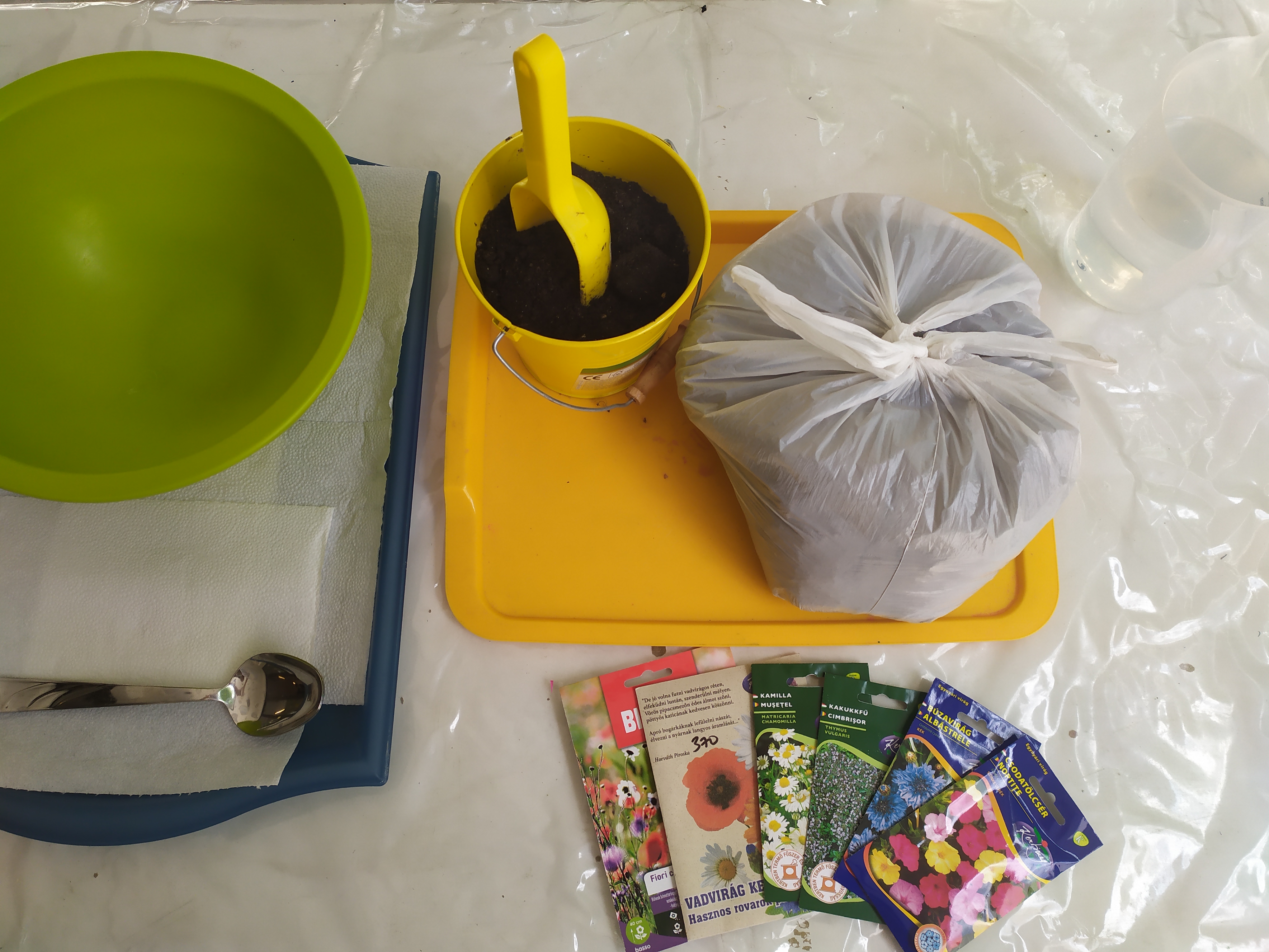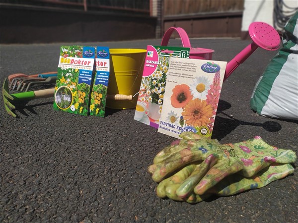 A már meglévő virágládákat előkészítettük: kigyomláltuk őket, eltávolítottuk az elszáradt növényeket, friss földdel töltöttük fel, majd a magokat elszórtuk és megöntöztük.