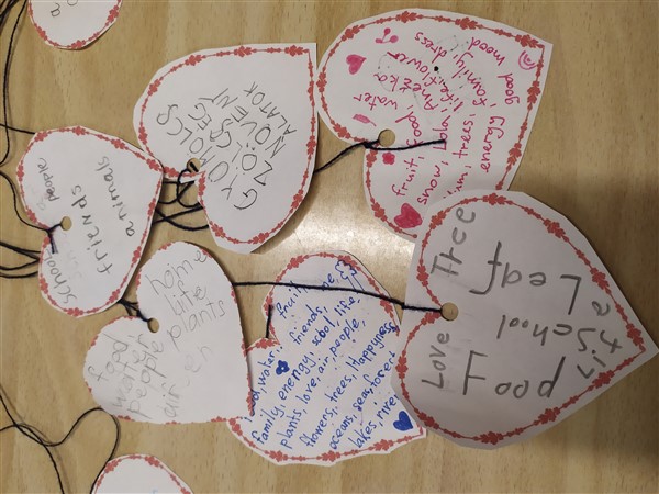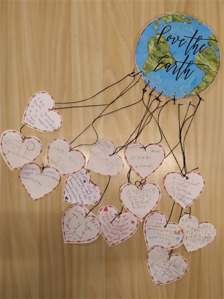 A gyerekek előhívták a már meglévő tudásukat a Föld bolygó mozgásait illetően; beszéltünk az idő múlásáról, az évszakok ciklikusságáról, valamint a nappalok és az éjszakák váltakozásáról - és mindezek okairól. Átgondoltuk és papírra vetettük, hogy miért vagyunk hálásak a Földnek, mennyi mindennel ajándékoz meg minket. A gyerekek ötleteiket, egyénileg, szív alakú papírra írták vagy rajzolták, melyekből aztán egy poszter készült.
