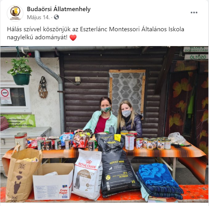 A Budaörsi Állatmenhely részére szerveztünk adománygyűjtést, mely során a gyerekek szülei konzerves kutya-, és macskaeledelt, száraz tápot, takarókat, törölközőket hoztak be az iskolába. Az adományokat kiszállítottuk a menhelyre még aznap, ahol a kisállatok és gondozóik nagy örömmel fogadtak minket.